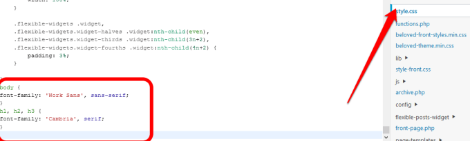1. للقيام بذلك ، افتح ملف style.css الخاص بالسمة وأضف الكود لتصميم العناصر الفردية باستخدام خطوط الويب كما يلي: