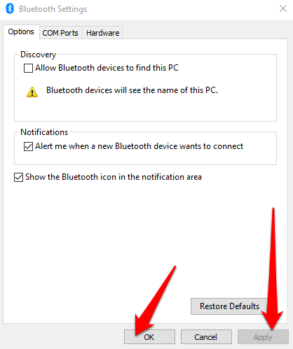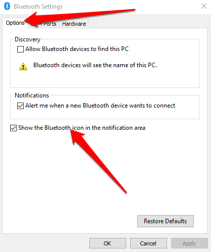 - حدد المربع إظهار رمز Bluetooth في منطقة الإعلام ضمن علامة التبويب "خيارات" .