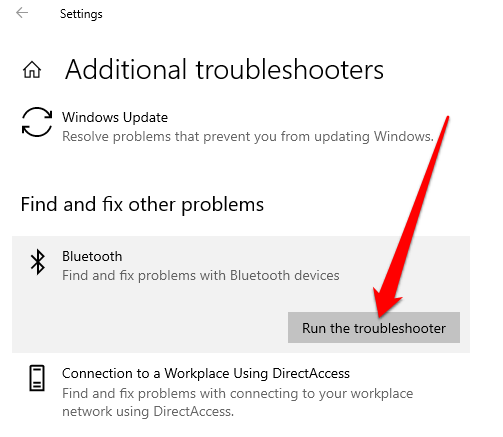- ارجع إلى الإعدادات > التحديث والأمان > استكشاف الأخطاء وإصلاحها > أدوات استكشاف الأخطاء وإصلاحها الإضافية > Bluetooth > تشغيل مستكشف الأخطاء ومصلحها من قائمة البحث عن المشكلات الأخرى وإصلاحها .