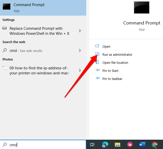 - اكتب CMD في مربع البحث وحدد تشغيل كمسؤول ضمن موجه الأوامر.