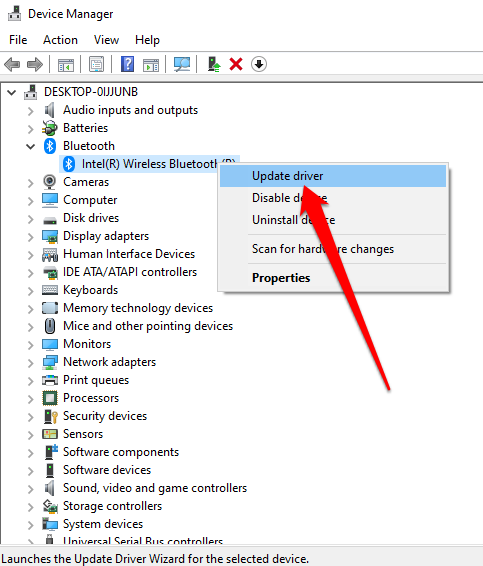 - انقر بزر الماوس الأيمن فوق ابدأ > إدارة الأجهزة > Bluetooth > اسم محول Bluetooth الخاص بك (تتضمن بعض المحولات كلمة راديو).