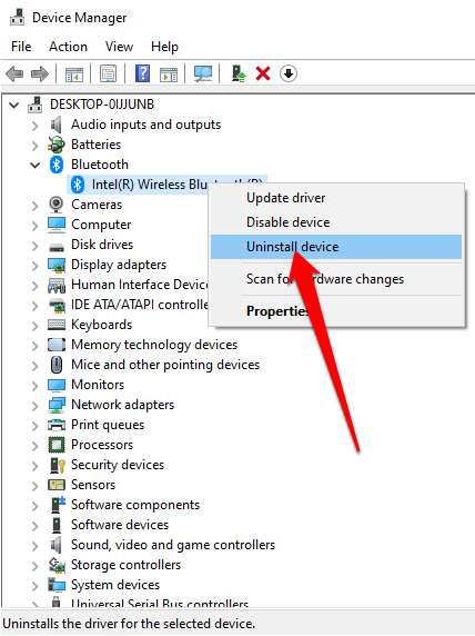 - انقر بزر الماوس الأيمن فوق اسم محول Bluetooth وحدد إلغاء تثبيت الجهاز .