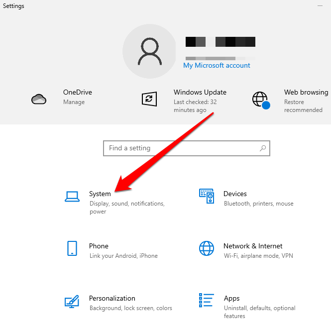 - حدد البدء > الإعدادات > النظام .