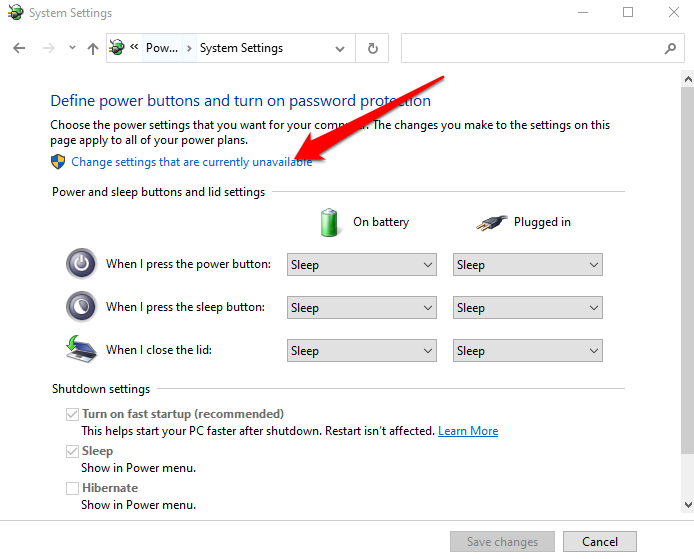- بعد ذلك ، حدد اختيار ما يفعله زر الطاقة > تغيير الإعدادات غير المتاحة حاليًا .