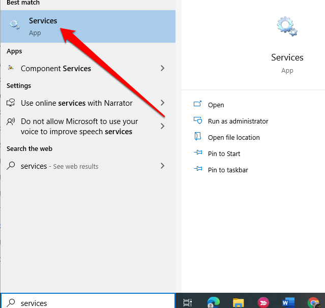 - اكتب الخدمات في شريط البحث وحدد خيار الخدمات .
