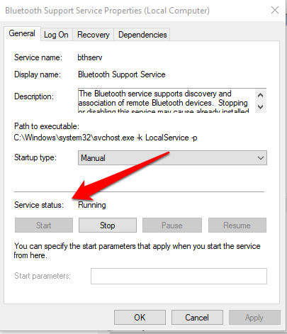 - في نافذة الخصائص ، تحقق مما إذا كانت حالة الخدمة معينة على التشغيل .