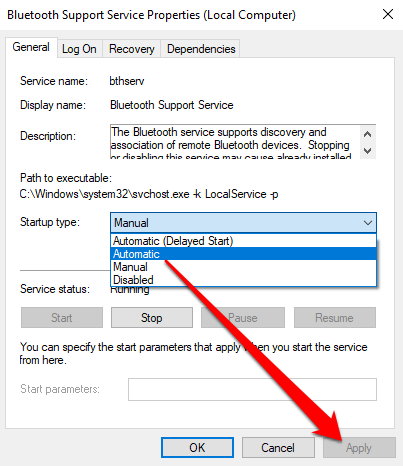 - حدد Stop and Start لإعادة تشغيل الإعداد بسرعة. إذا لم تكن الحالة قيد التشغيل ، فحدد تلقائي في القائمة المنسدلة نوع بدء التشغيل .