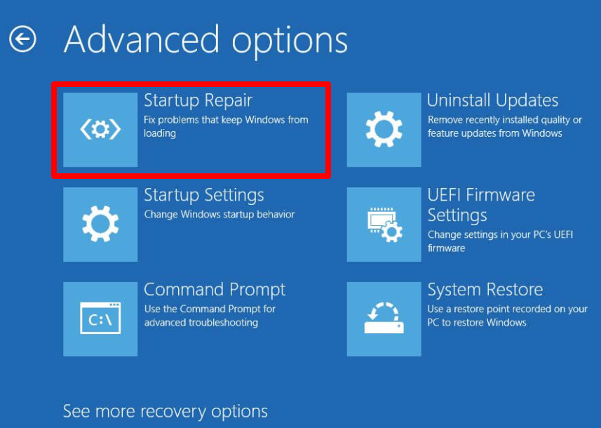 - في شاشة التمهيد ، حدد استكشاف الأخطاء وإصلاحها > الخيارات المتقدمة > إصلاح بدء التشغيل .