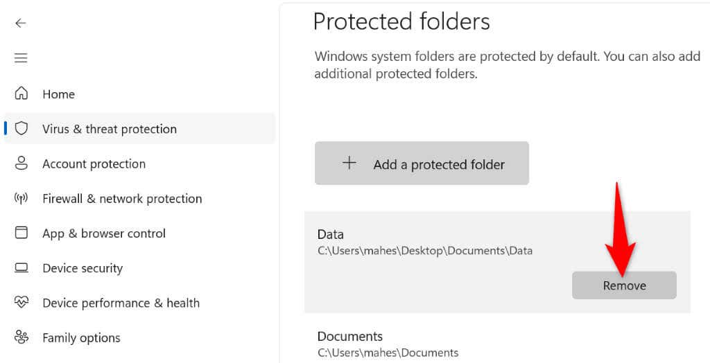 إذا كنت تريد الاحتفاظ بالميزة ممكّنة ، فيمكنك إزالة المجلد الخاص بك من القائمة المقيدة. بهذه الطريقة ، يمكنك إجراء تغييرات على المجلد الخاص بك مع الحفاظ على تمكين ميزة أمان Windows.