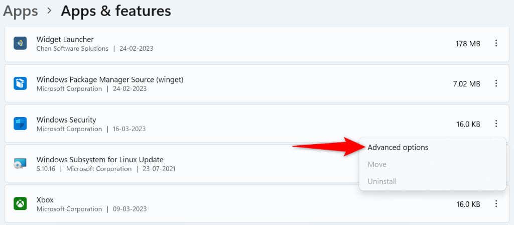 - ابحث عن أمان Windows في قائمة التطبيقات ، وحدد النقاط الثلاث بجوار التطبيق ، واختر خيارات متقدمة .