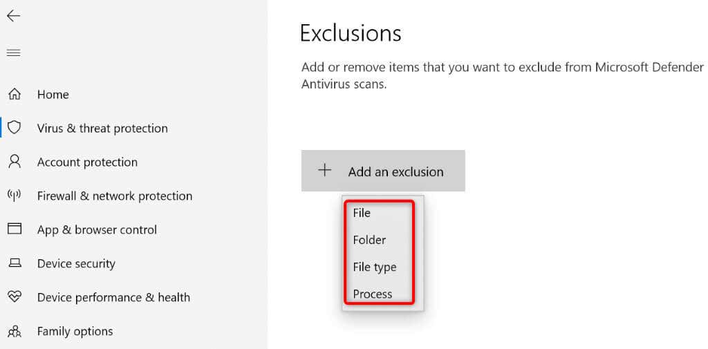- اختر إضافة استثناء وحدد نوع العنصر الذي تريد إضافته إلى القائمة. سنختار ملف .