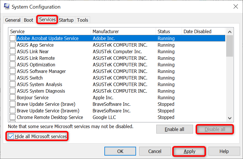 - انتقل إلى علامة التبويب الخدمات ، وحدد إخفاء جميع خدمات Microsoft ، واختر تعطيل الكل ، وحدد تطبيق .