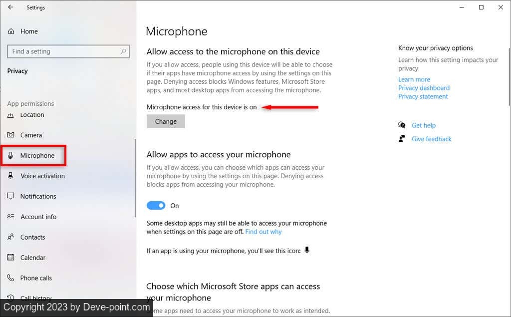 - تأكد من تشغيل الوصول إلى الميكروفون لهذا الجهاز .
