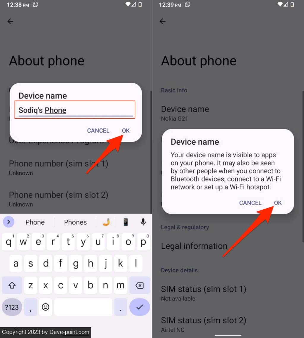 2. سترى رسالة تفيد بأن اسم جهازك مرئي للتطبيقات والأشخاص والأجهزة المتصلة بهاتفك. انقر فوق "موافق" لتغيير اسم جهازك وتجاهل النافذة المنبثقة.