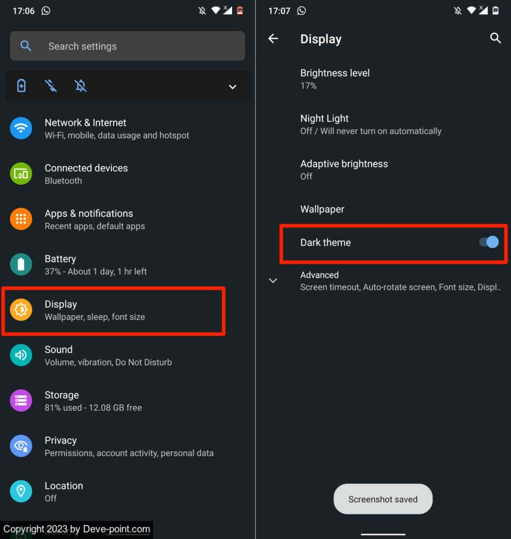افتح تطبيق "الإعدادات" ، وانقر على "العرض" (أو العرض والسطوع ) ، وبدّل إلى " المظهر الداكن " (أو الوضع الداكن ).