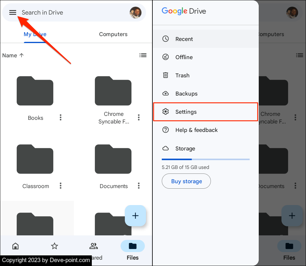 - افتح Google Drive ، وانقر فوق رمز قائمة الهامبرغر في الزاوية العلوية اليسرى ، وحدد الإعدادات .