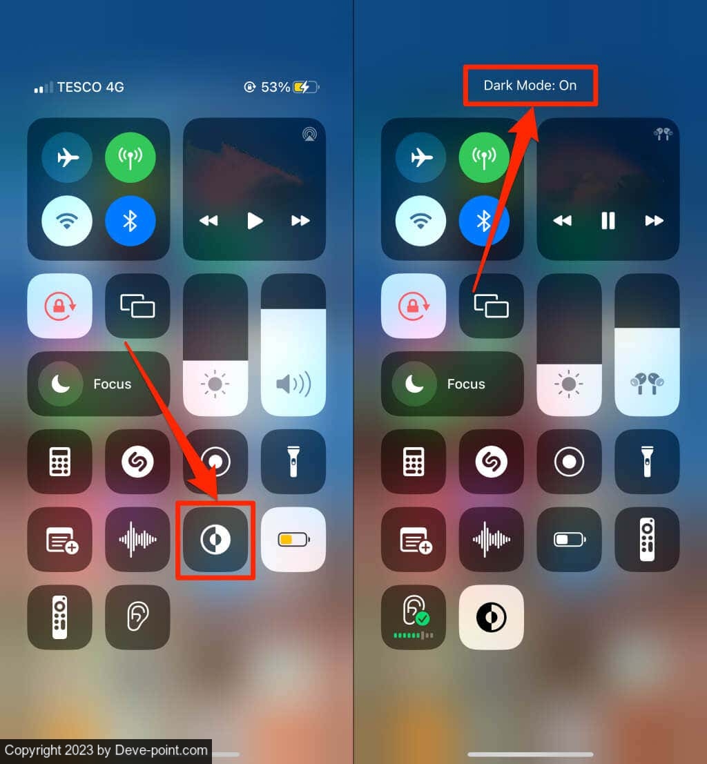 يمكنك أيضًا تمكين أو تعطيل الوضع المظلم من مركز التحكم بجهازك. افتح