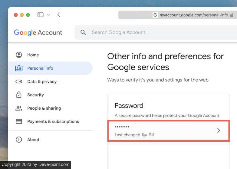 1. حدد المعلومات الشخصية على الشريط الجانبي لإعدادات حساب Google ، ثم قم بالتمرير لأسفل إلى قسم المعلومات والتفضيلات الأخرى لخدمات Google واختر كلمة المرور .