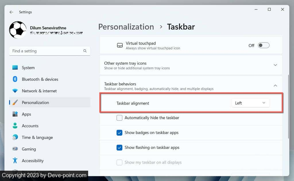 - انتقل إلى التخصيص > شريط المهام وقم بتوسيع سلوكيات شريط المهام .