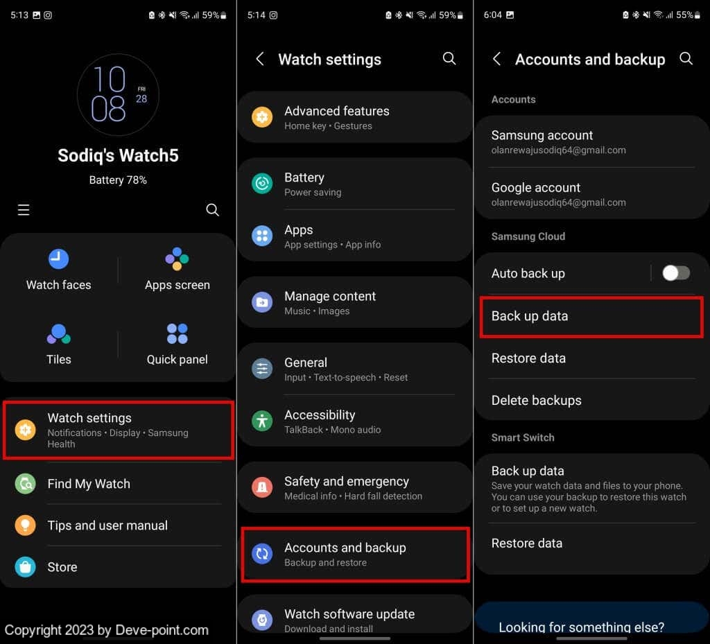 بدلاً من ذلك ، افتح تطبيق Galaxy Wearable ، وانتقل إلى إعدادات الساعة > الحسابات والنسخ الاحتياطي ، وانقر فوق نسخ البيانات احتياطيًا .